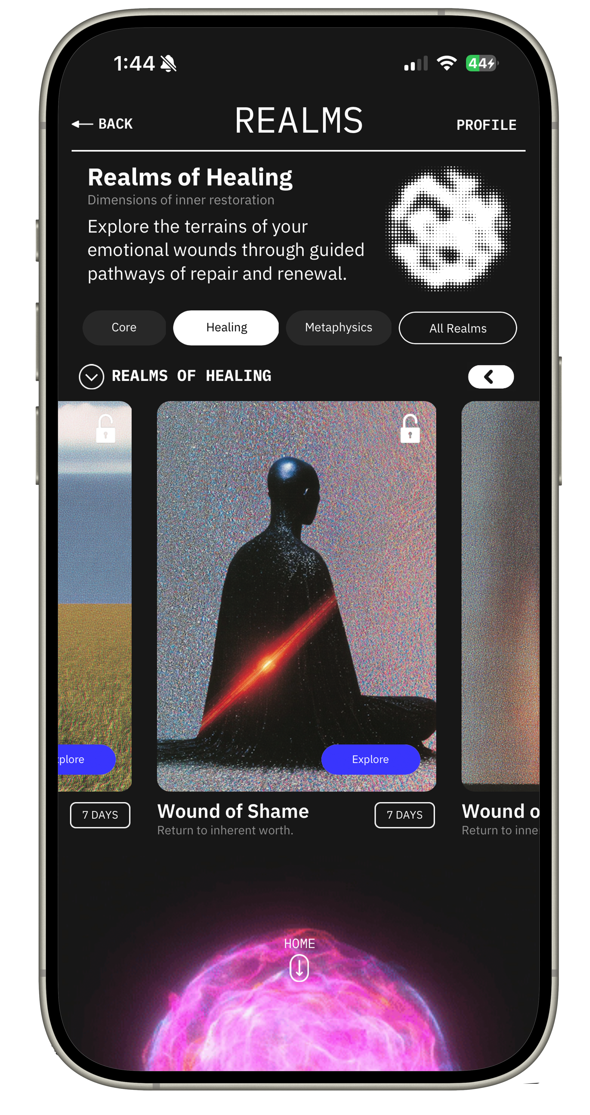 Enter a Healing Realm and follow a guided pathway of repair and renewal. Each journey focuses on a specific wound and gives you daily teachings, reflection prompts, and practices that help you feel safely and respond differently. The goal is real change, not endless processing.