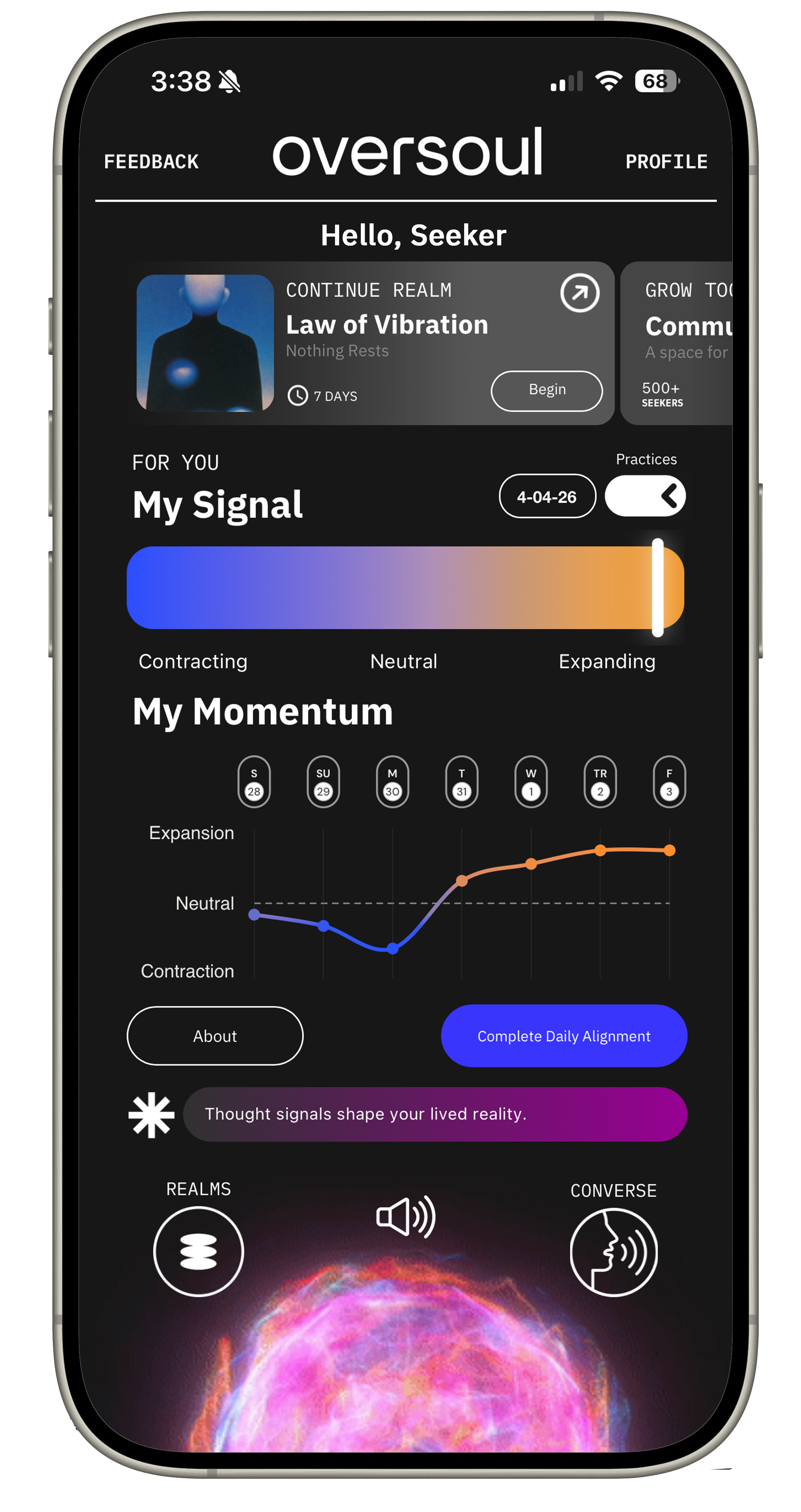 Your inner state leaves patterns. Daily Alignment helps you track your signal, contracting, neutral, or expanding and see your momentum over time. Instead of guessing how you’re doing, you can notice what’s pulling you into anxiety and what brings you back to steadiness, then course-correct early.